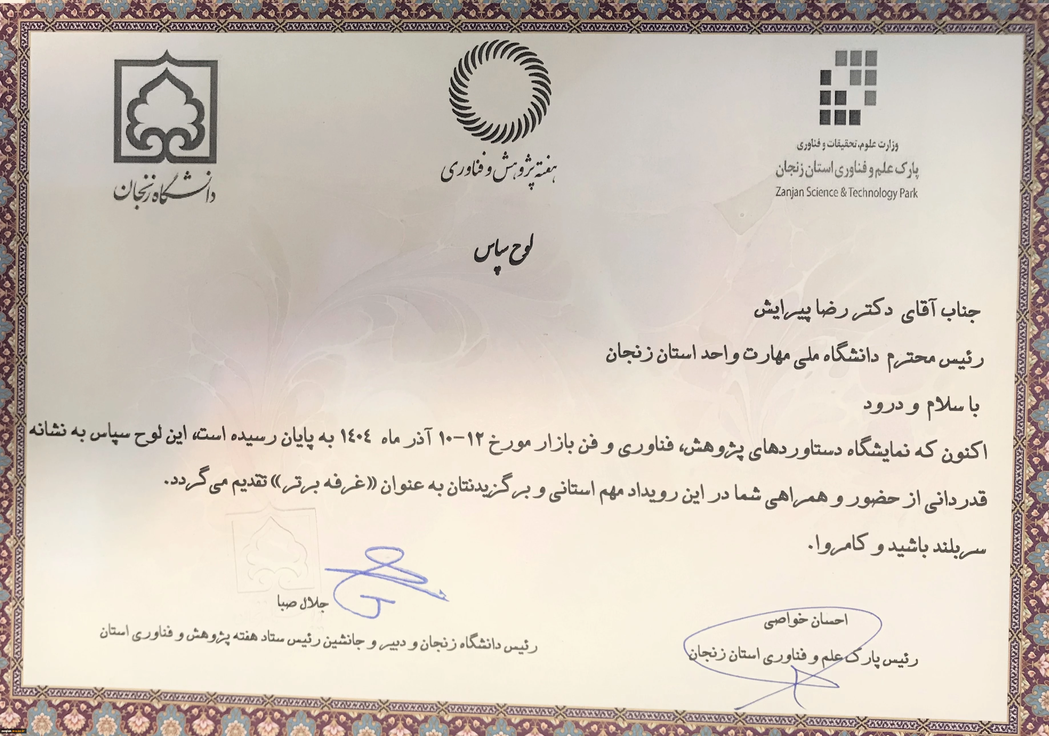 غرفـه دانشگاه ملی مهارت استان زنجان انتخاب بعنوان " غرفـه برتــر " در بیست و ششمین نمایشگاه دستاوردهای پژوهش، فناوری و فن بازار ۱۴۰۴ 2