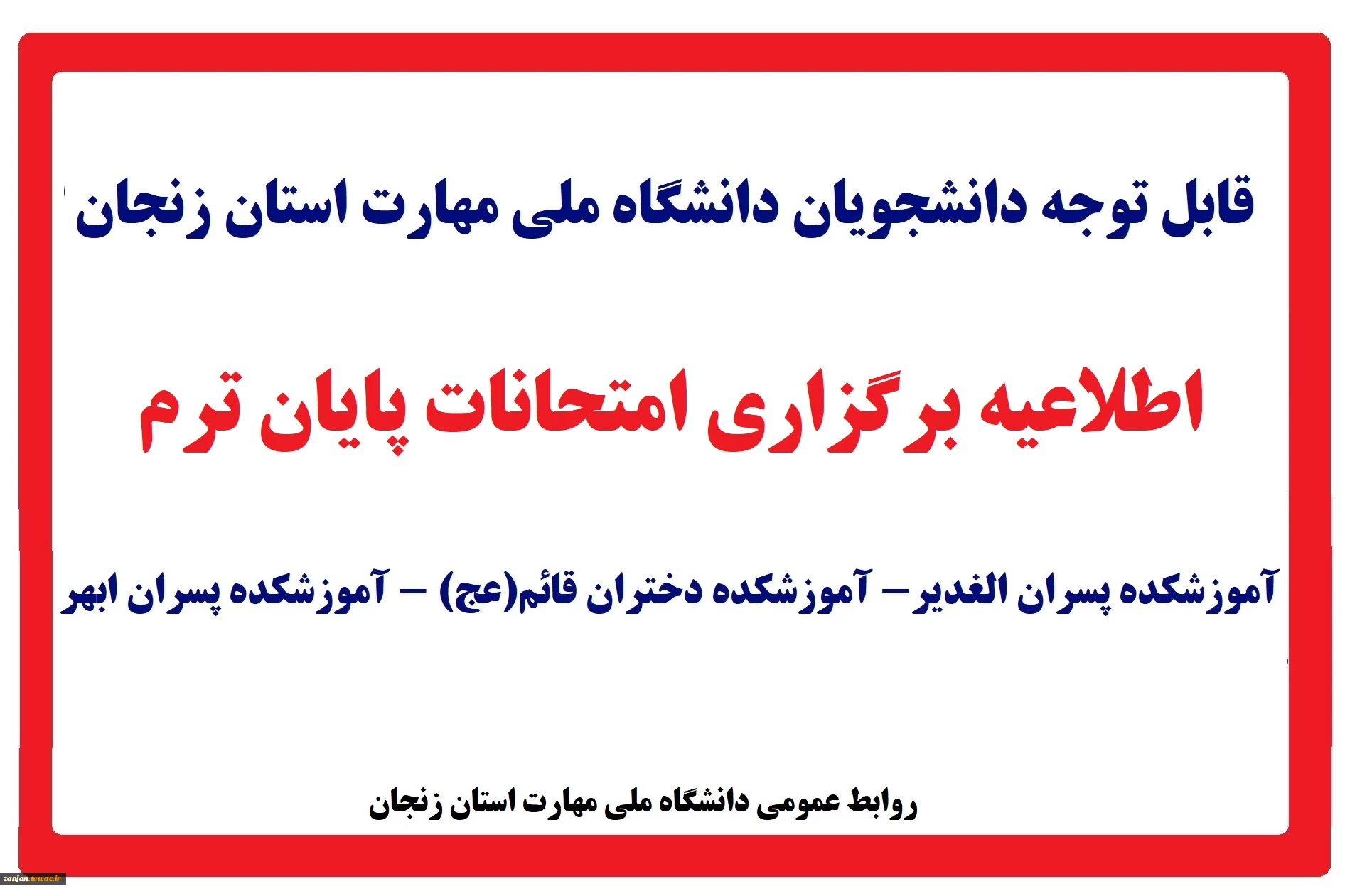 امتیاز دهید : اطلاعیه برگزاری امتحانات پایان ترم نیمسال اول سال تحصیلی 1405-1404 2 سهشنبه 23 دی 1404 ساعت 12:03